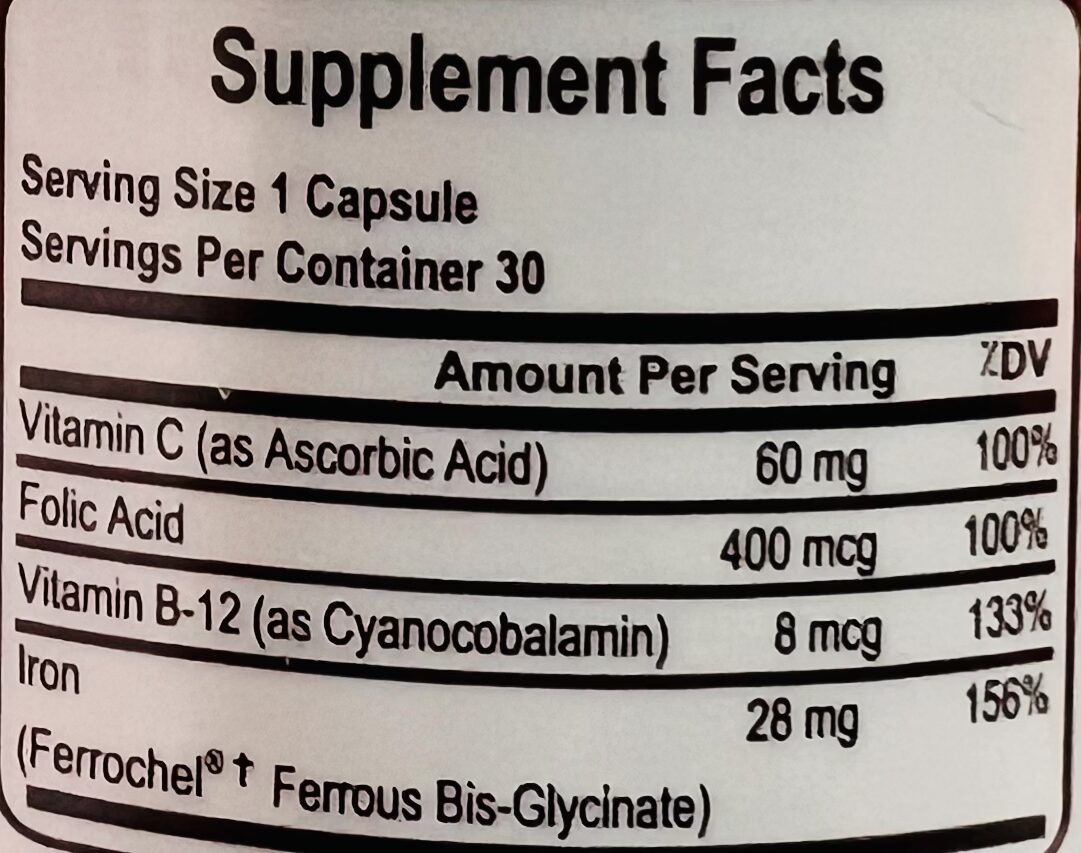 Iron ( as Ferrous Bis-Glycinate ): 28 mg