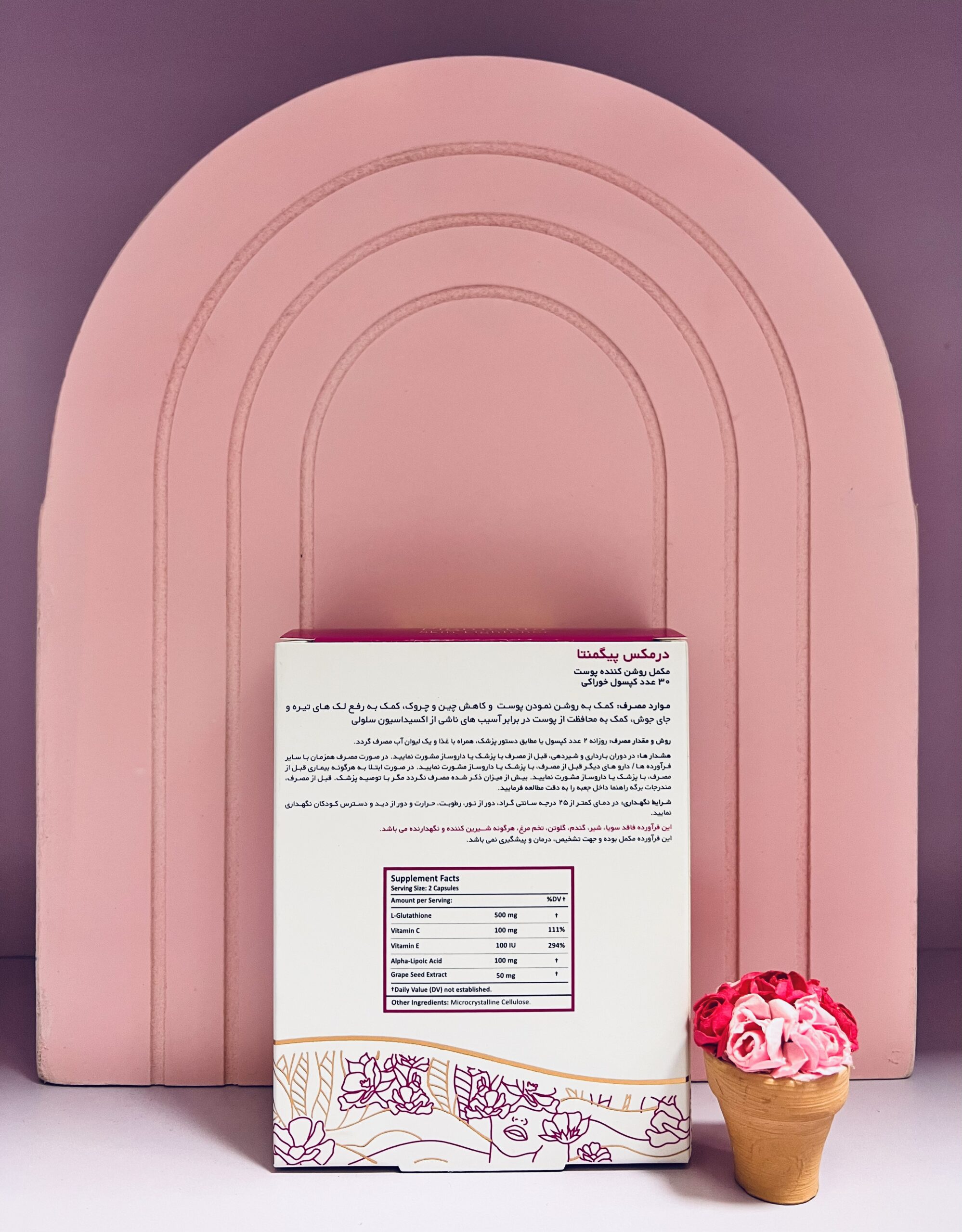 مکمل درمکس پیگمنتا حاوی گلوتاتیون و سایر آنتی اکسیدان ها می باشد که منجر به روشن شدن پوست، کاهش چین و چروک، رفع لک های تیره، جای جوش و همچنین محافظت پوست در برابر رادیکال های آزاد و اکسیداسیون سلولی می شود.