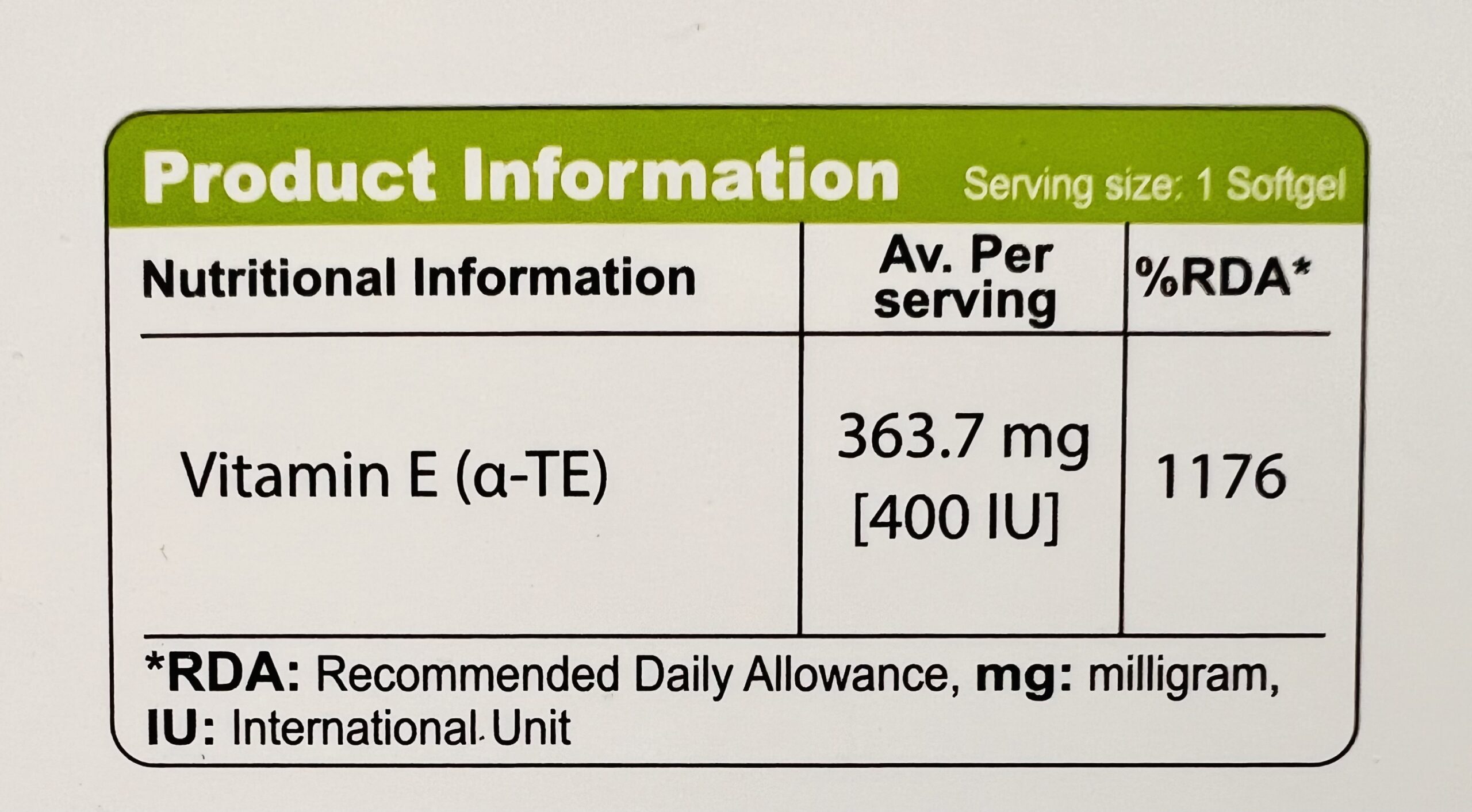 Vitamin E ( Alfa Tocopheryl Acetate ): 363.7 mg (400 IU)