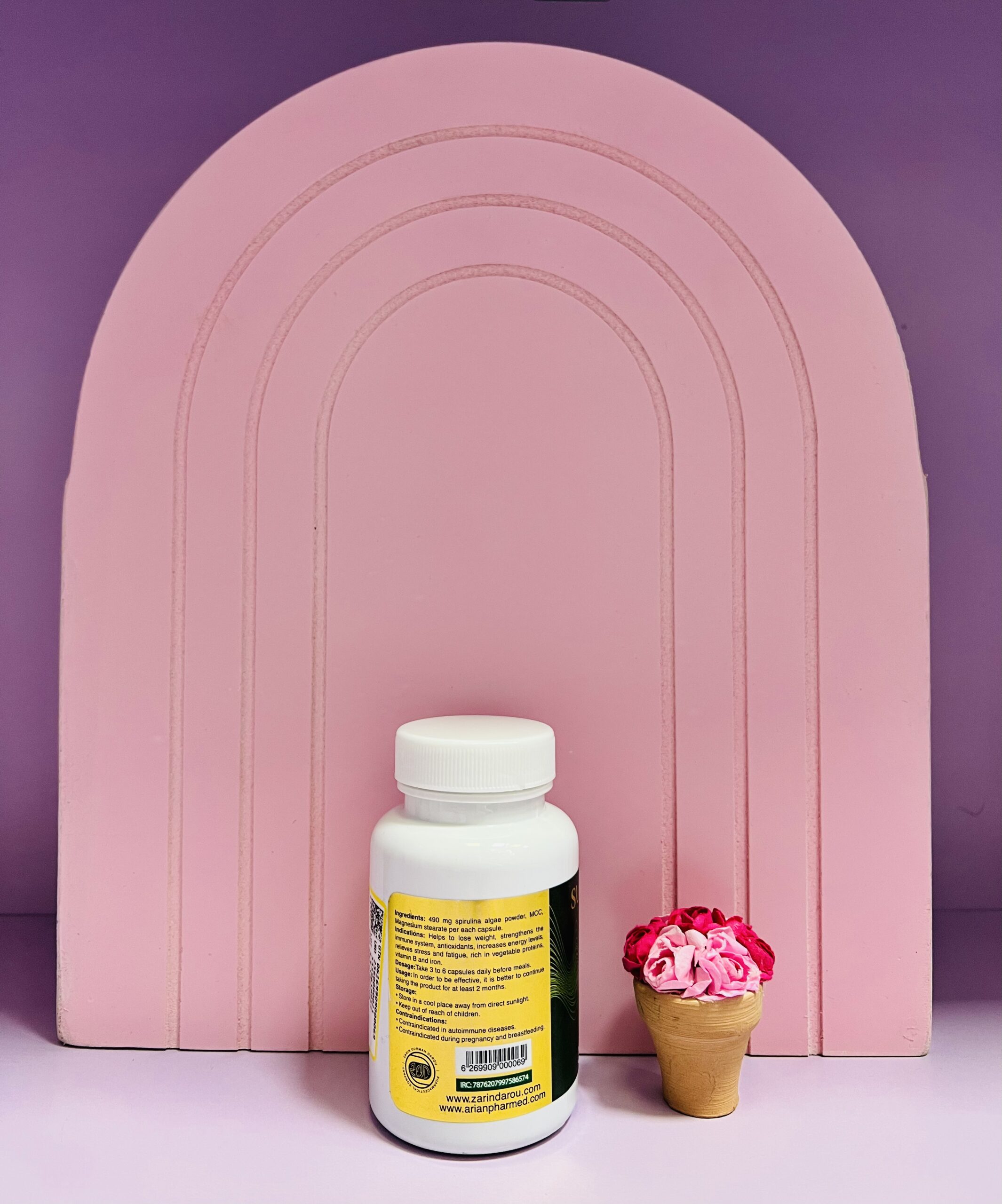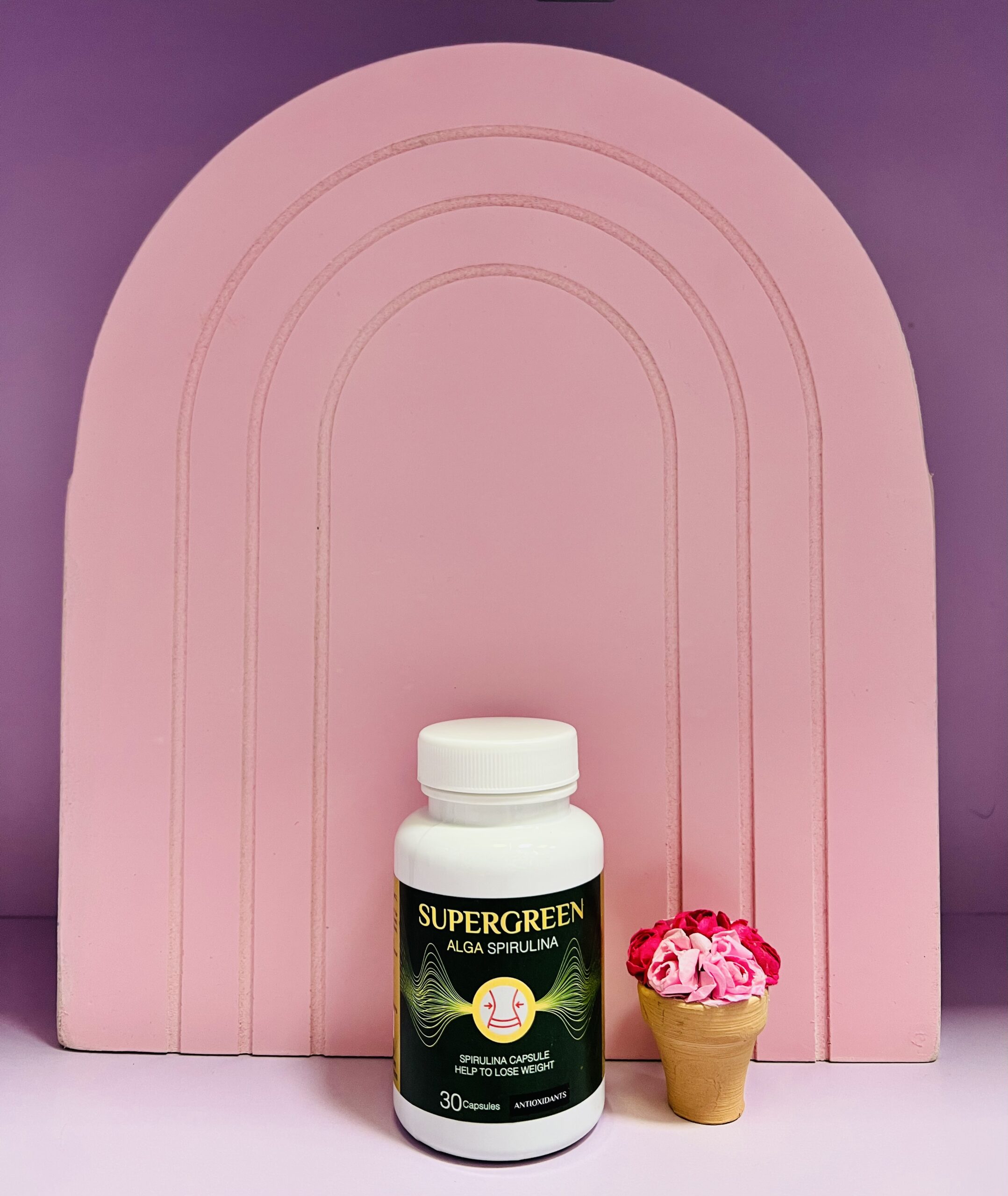 سوپر گرین اسپیرولینا مکمل غذایی حاوی 490 میلیگرم پودر جلبک اسپیرولینا میباشد که غنی از آنتی اکسیدان ها، پروتئین های گیاهی، ویتامین های گروه ب و املاح معدنی میباشد و به کاهش وزن، تقویت سیستم ایمنی، افزایش سطح انرزی، رفع استرس و خستگی و همچنین از بین بردن رادیکال های آزاد کمک میکند.
