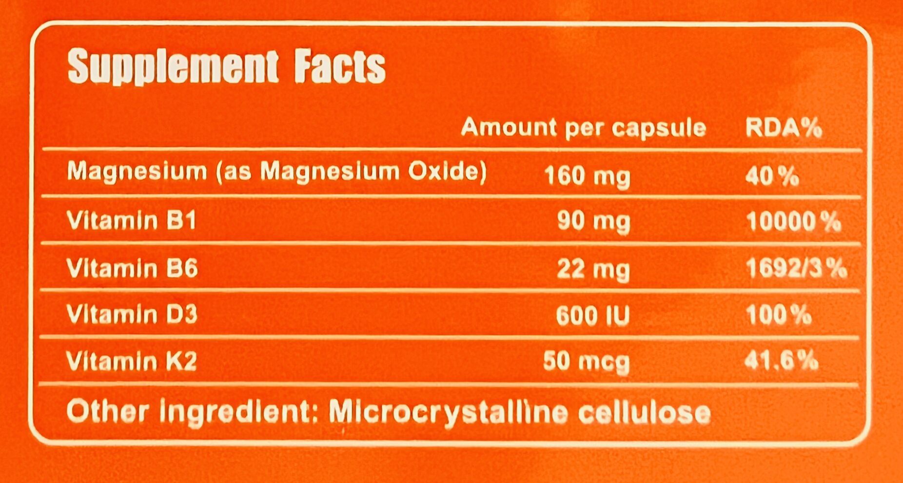 مکمل مگنیبان حاوی منیزیوم اکساید، ویتامین های ب1، ب6، د3 و کا می باشد و به حفظ سلامت سیستم عصبی و عضلانی، بهبود اسپاسم و گرفتگی عضلات و همچنین پیشگیری از میگرن کمک می کند.