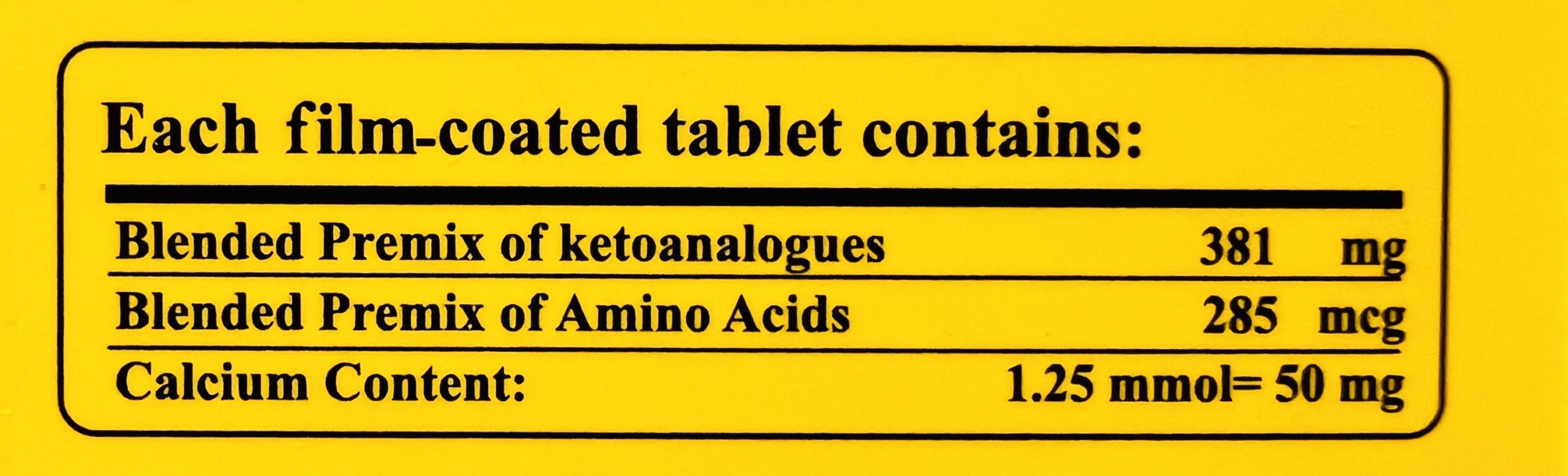 کتالوگ مکمل تغذیه ای حاوی کتوآنالوگ به همراه اسید های آمینه ضروری می باشد که به کاهش پیشرفت نارسایی کلیوی، افزایش انرژی، کاهش بار کلیوی، تعویق در شروع دیالیز، تامین پروتئین کافی در بیماران کلیوی و جلوگیری از سوء تغذیه در این افراد، کاهش پروتئینوری، بهبود متابولیسم کلسیم فسفات و بهبود اسیدوز متابولیک کمک می کند.